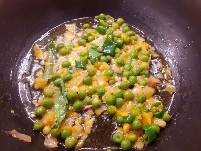 2. Frying Onions, Green Chilli, Curry Leaves and Peas