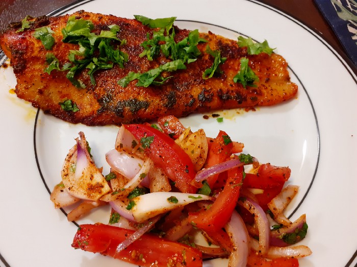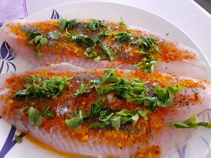 - Marinate fish with salt, black pepper, red paprika, turmeric, lemon juice, ginger garlic paste and fresh coriander