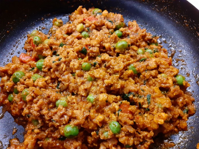 - Add minced chicken (kheema) and boiled peas