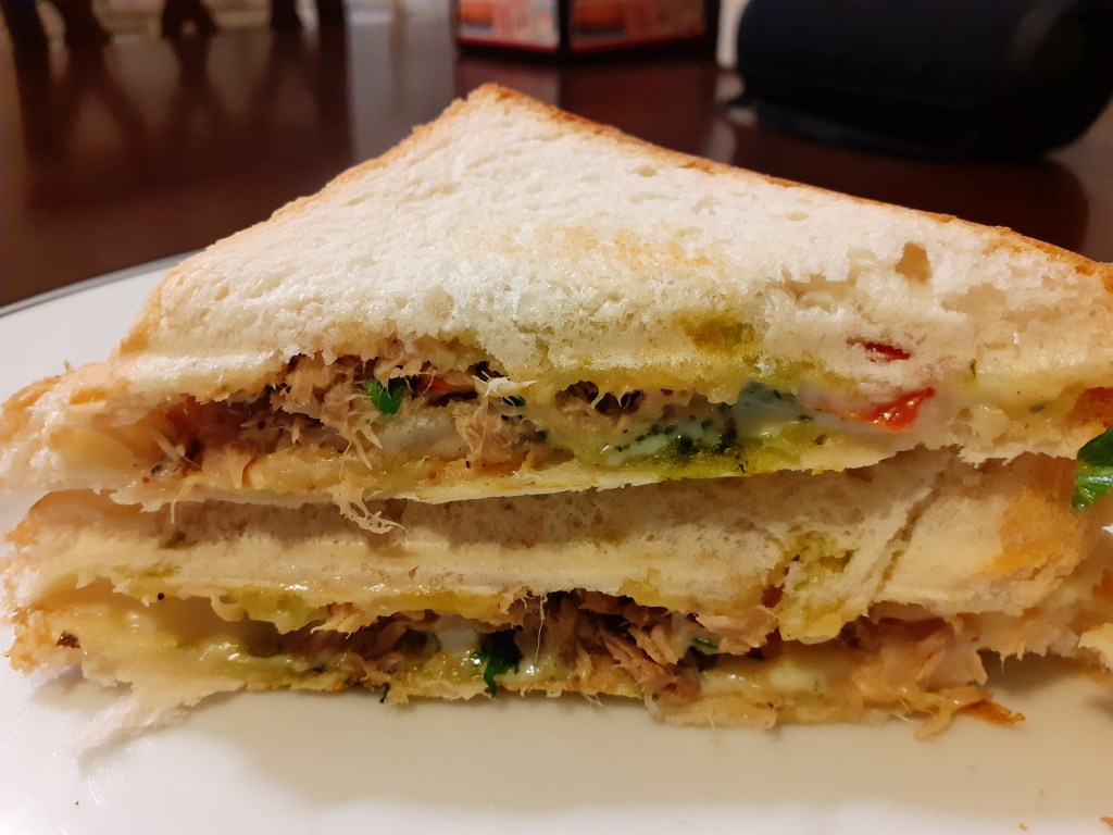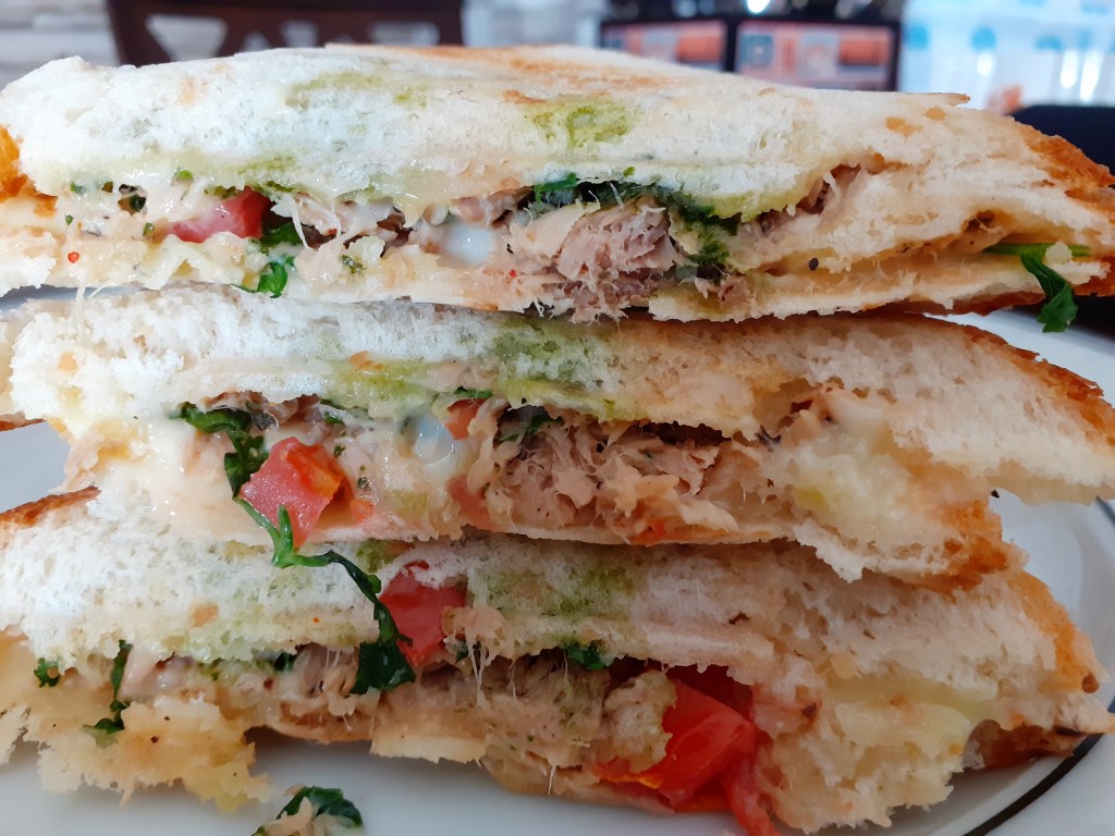 - Make bread sandwich with cheese, mint chutney or basil pesto (if available), and tuna salad mix