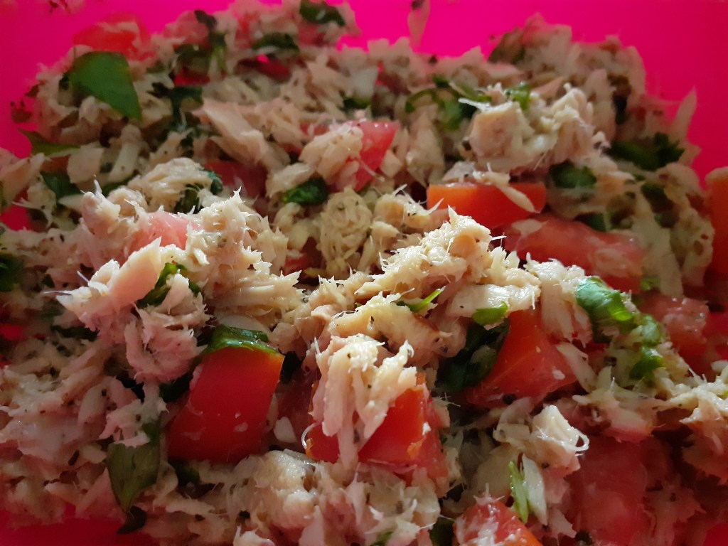 Tuna Salad: mixture of chunky tuna, diced tomatoes, fresh coriander leaves, lemon, ginger, salt, black pepper, misc herbs