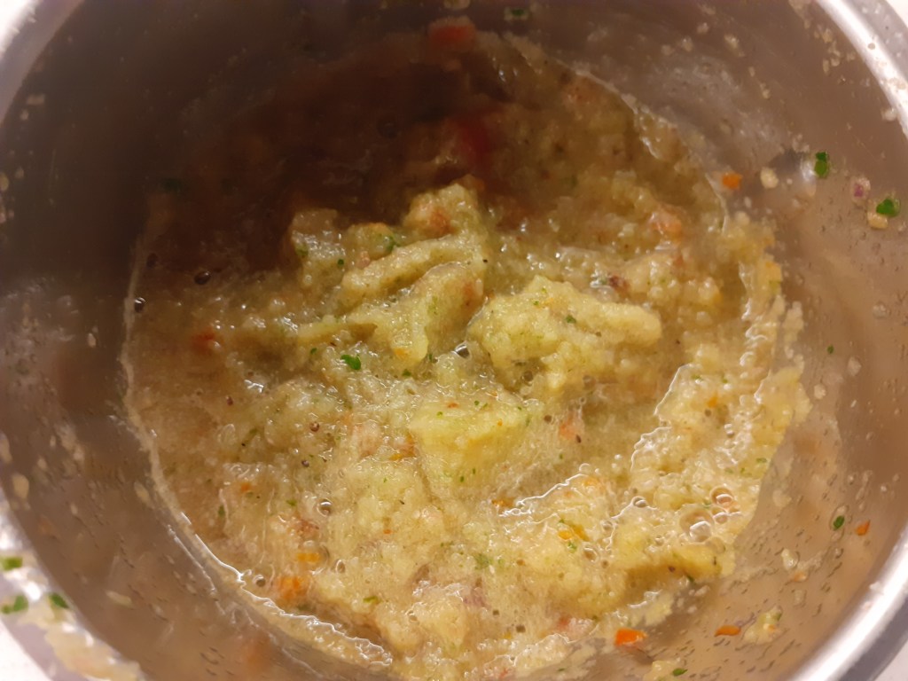 - In a mixer, make curry paste with 1/2 onion, 1/2 tomato, fresh coriander, 2-3 pieces of cloves, cardamom, peppercorns