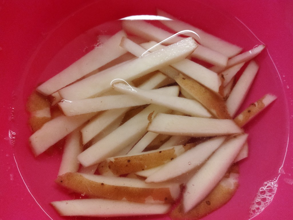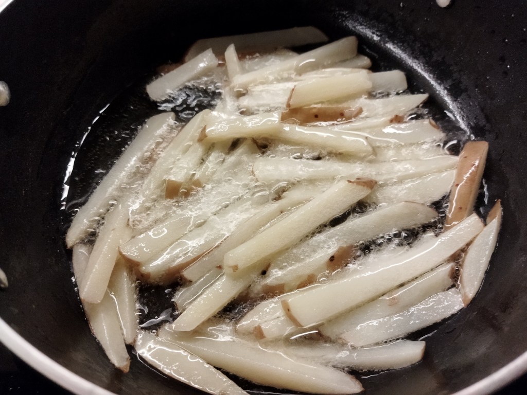 - In wok or deep frying pan, add cooking oil sufficient to deep fry potatoes
