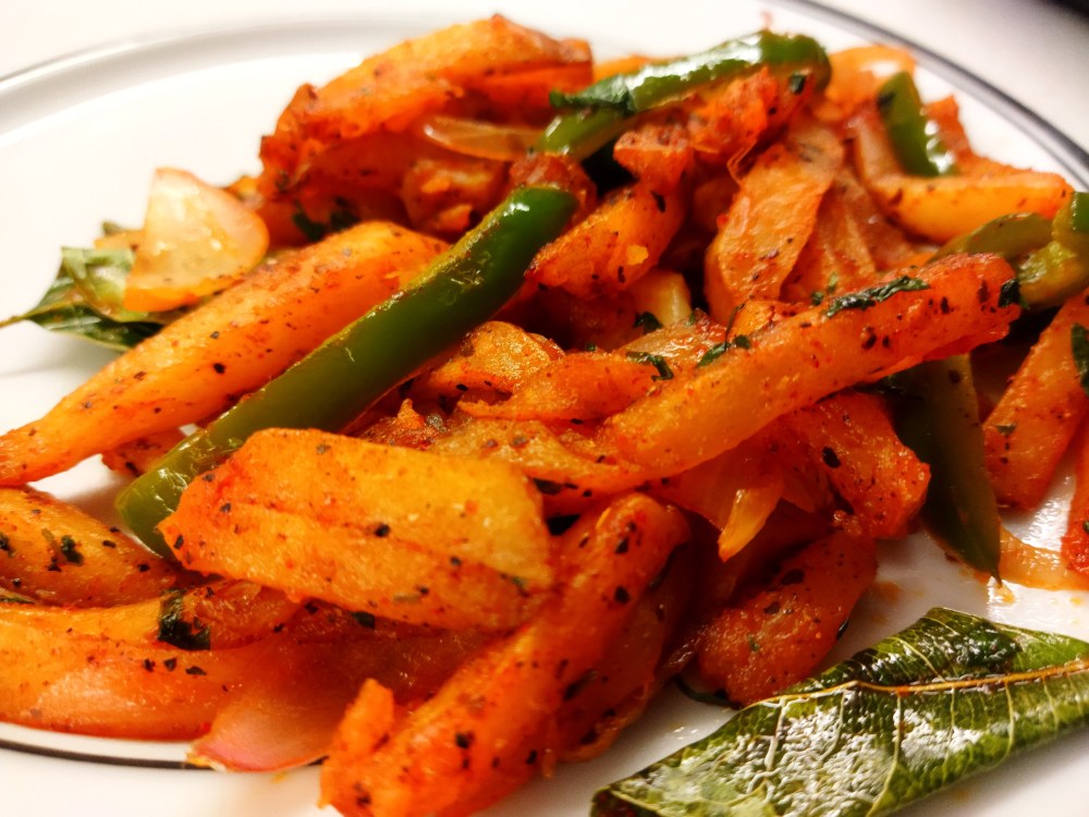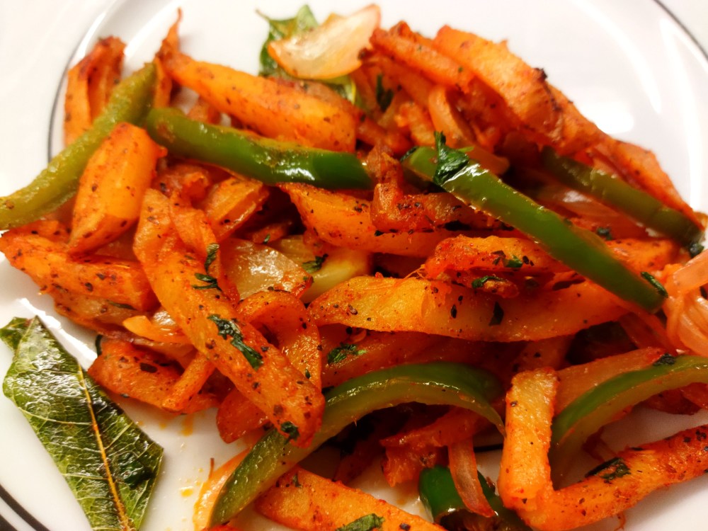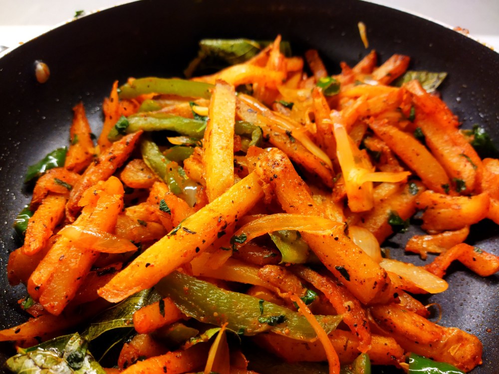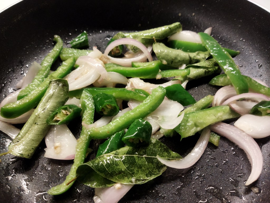 - Add vegetables: onions, capsicum, red / green chilli and curry leaves