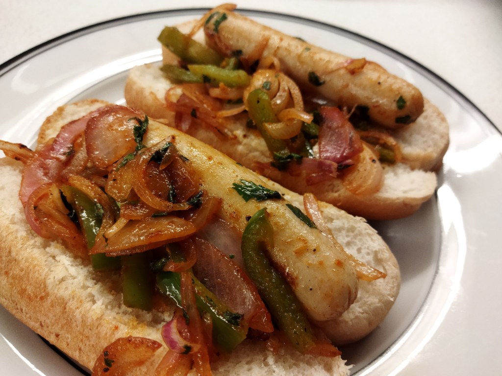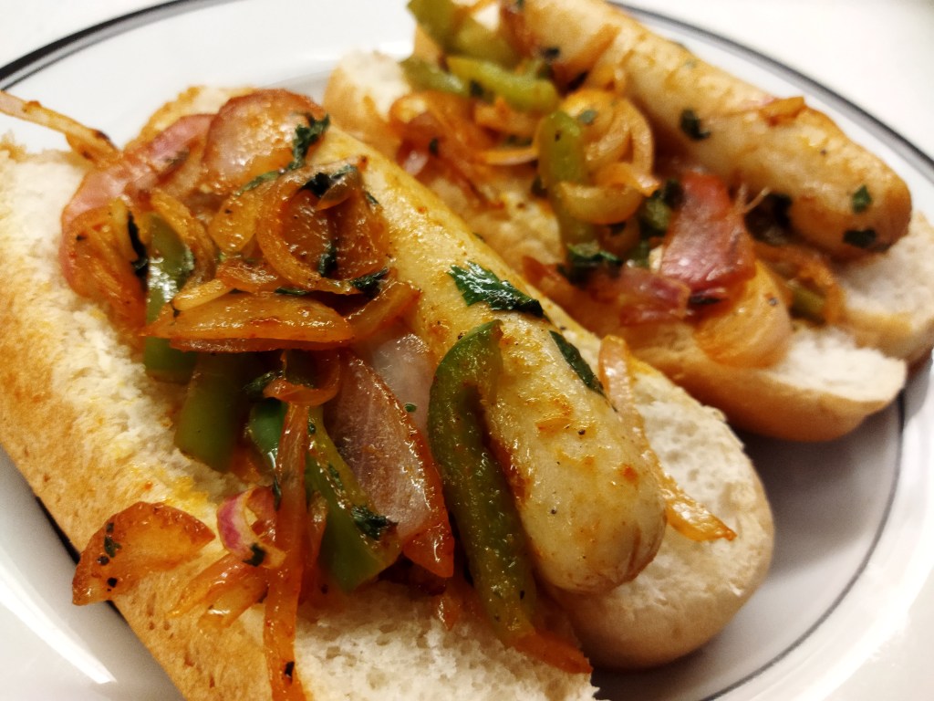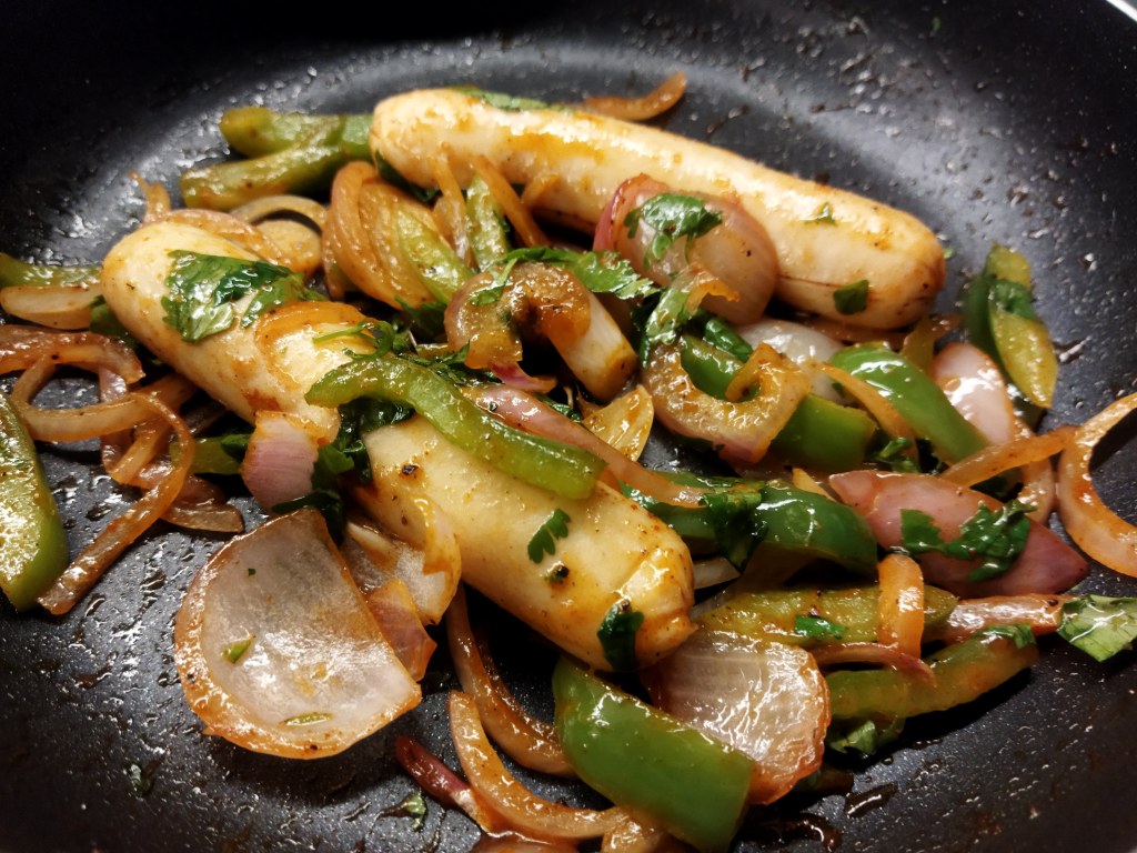 2. Grill or fry chicken sausages with onions, green peppers, misc spices and sauces (listed above)