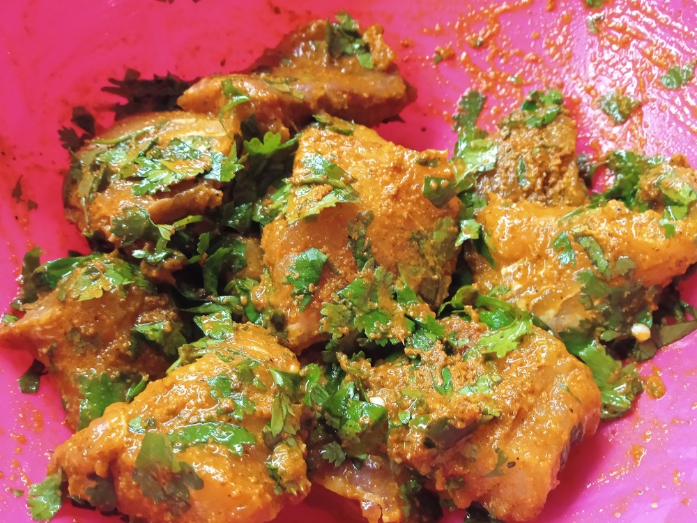 - In a mixing bowl, marinate fish with salt, black pepper, red chilli powder, turmeric, cumin + coriander powder, ginger paste and lemon juice