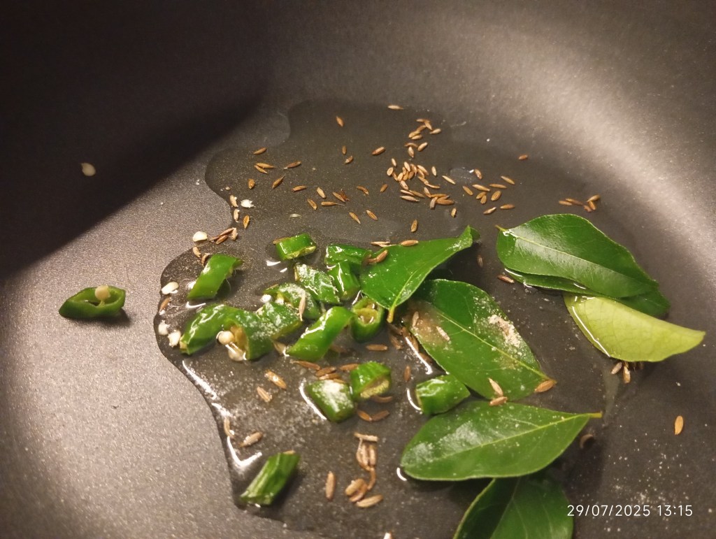 Step 7: In frying pan, add 2 spoons of cooking oil, curry leaves, chopped green chilli, cumin seeds (jira) and mustard seeds